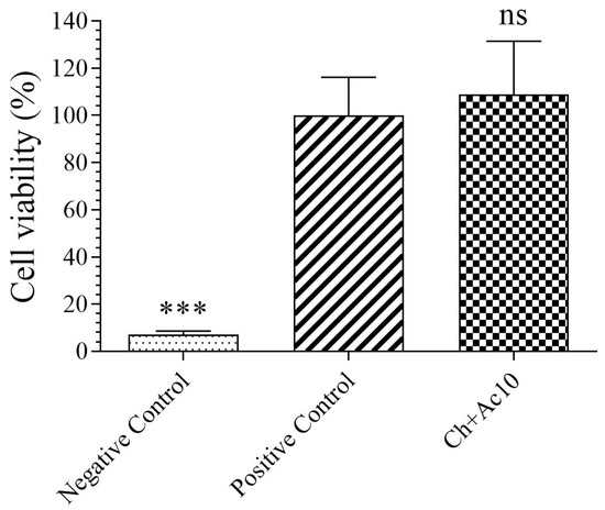 3-[4,5-dimethylthiazol-2-yl]-2,5-diphenyl tetrazolium bromide (MTT) cytotoxicity test of extracts acquired from chitosan/acetic acid film (Ch+Ac10), positive (cells without contact with sample) and negative (cells with zinc solution) controls cultured with human keratinocyte HaCaT cells at 37 °C. *** p < 0.001; ns: not significant.