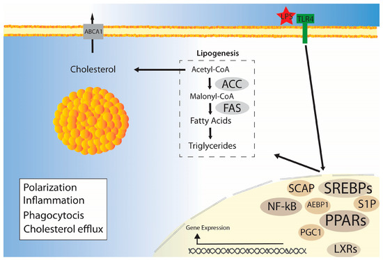 Schematic figure depicting lipogenesis and cholesterol metabolism. Acetyl-CoA can be used for the synthesis of fatty acids. ACC (acetyl-CoA carboxylase) and FAS (fatty acid synthase) are key enzymes for lipogenesis, which is enhanced in classically activated macrophages via LPSs (lipopolysaccharides) and the TLR4 (Toll-like receptor 4) pathway. Acetyl-CoA can be converted to cholesterol, which can be further esterified and included in lipid droplets as well. Several transcription factors and co-factors regulate fatty acids and cholesterol metabolism and their effects on macrophage polarization, inflammation, phagocytosis, and cholesterol efflux. Examples of these factors include SREBPs (sterol regulatory element-binding proteins), PPARs (proliferator-activated receptors), LXRs (liver X receptors), S1P (SREBP processing through site-1 protease), SCAP (SREBP cleavage-activating protein), AEBP1 (adipocyte enhancer-binding protein 1), PGC1 (PPARγ-coactivator 1), and NF-κB (nuclear factor kappa-light-chain-enhancer of activated B).