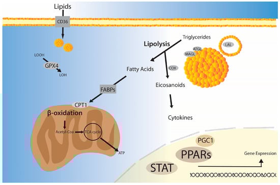 Schematic figure depicting lipolysis, fatty acid oxidation, and lipid uptake and transport. Lipids are taken up by CD36, a class B scavenger receptor, prior to incorporation on lipid droplets and organelles. The lipases ATGL (adipose triglyceride lipase), MAGL (monoacylglycerol lipase), and LAL (lysosomal acid lipase) are part of the catabolic reactions that break down triglycerides into fatty acids, releasing lipid mediators such as eicosanoids (e.g., prostaglandins) via the activity of COX (cyclooxygenase), for example. FABPs (fatty-acid-binding proteins) can transport free fatty acids into mitochondria for ATP production. CPT1 (carnitine palmitoyl transferase 1) is a key enzyme for β-oxidation that releases acetyl-CoA, which can be used in the tricarboxylic acid (TCA) cycle. GPX4 (glutathione peroxidase 4) is involved in the reduction of lipid peroxides (LOOH) into lipid alcohols (LOH), preventing ferroptosis and oxidative stress. The transcription factors and their associated co-factors, such as PPARs (proliferator-activated receptors), STA (signal transducer and activator of transcription), and PGC1 (PPARγ-coactivator 1), are part of the regulation of lipid-metabolism-related genes and their effects on macrophage functions.