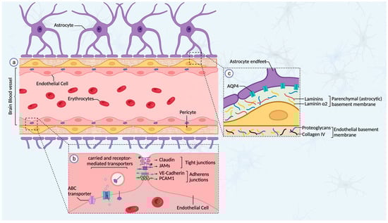 Schematic representation of the blood–brain barrier (BBB). The BBB is a specialized structure comprising endothelial cells (ECs), pericytes, basement membrane, and astrocytes (a). The ECs are anchored together by tight-junction (claudins, JAMs) and adherent-junction (VE-cadherin, PCAM1) proteins, thereby limiting any paracellular transport into the brain. The transport of soluble factors into the brain parenchyma is facilitated by carrier-mediated or receptor-mediated transporters (b). Pericytes, which surround the blood vessel, also play an important role in regulating BBB permeability by modulating the formation of tight junctions in ECs as well as by secreting the components of the endothelial basement membrane with the support of the ECs. The astrocytes also play a role in supporting the maintenance of the BBB barrier by secreting the components of a second layer of basement membrane (parenchymal basement membrane) and by connecting their endfeet to surround the BBB (c).