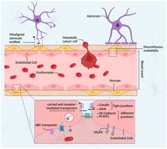 Schematic representation of the brain–tumor barrier (BTB). After initial metastatic colonization in the brain, BC cells induce the process of neo-angiogenesis, resulting in the formation of a new neurovascular-tumor unit known as the BTB. The BTB is not selective when compared with the intact BBB, mainly due to the loss of tight junctions between endothelial cells, which results in a discontinuous endothelium along the blood vessel that allows easy access of many cells, such as cancer and immune cells, to the brain parenchyma. Additionally, the decreasing and the misaligning of the astrocyte endfeet around the blood vessels contribute to the increase in permeability of the BTB (*). To further boost oxygen supply to the brain, endothelial cells stimulate angiogenesis by increasing the expression of VEGFR.