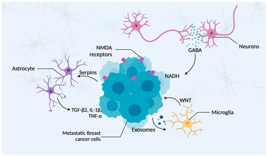 Schematic representation of the established interactions between metastatic BC and host stroma cells. Metastatic BC cells in the brain can express high levels of serpins to prevent the astrocyte metastasis-suppressive effect and can also stimulate these astrocytes to secrete TGF-β, IL-1β, and TNF-α, leading to tumor cell expansion. These BC cells can also secrete exosomes that stimulate microglia to support tumor progression through Wnt signaling and microglia polarization to an M2 phenotype. Furthermore, BC cells can exploit neurotransmitters secreted by neurons (e.g., GABA), as bio-precursors for the generation of NADH, further promoting tumor cell proliferation.