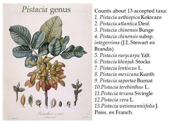 Linnaeus was the first to establish the genus Pistacia, recognizing six species as reported in his manuscript “Species Plantarum” (Linné Carl von Stearn WT 1753). The genus Pistacia belongs to the Anacardiaceae, a cosmopolitan family that comprises about 70 genera and over 600 species. The actual data report of the genus Pistacia lists 13 globally accepted species according to the WFO plant list (WFO Dic 2022) (Figure 1). With a wide distribution, the native range of this genus is Eurasia, Africa, and America (POWO) [8]. Species members are evergreen or mainly deciduous, and most of them are known to be strictly dioecious, which means that male and female flowers are housed on different plants with several exceptions such as P. chinensis and P. atlantica [9].