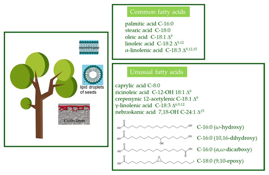 Fatty acids. Fatty acids are one of the most ubiquitous natural products in the form of complex mixtures of liquids or low-melting-point solids hard to separate and purify. In plants, fatty acids are components of glycerolipids (galactolipids, sulfolipids, phospholipids, betaine lipids, and triacylglycerols), sphingolipids, and extracellular lipids (cuticular waxes and lipid polyesters) [14]. They have a myriad of functions such as structural components of the membranes or cuticles [15], carbon and energy storage, and signal transduction [16]. Although more than 450 different fatty acids are known in the plant kingdom [17], only palmitic acid (C-16:0), stearic acid (C-18:0), oleic acid (C-18:1 Δ9), linoleic acid (C-18:2 Δ9,12), and α-linolenic acid (C-18:3 Δ9,12,15) [16], called “common fatty acids”, are widely present in membrane lipids and in triacylglycerols. Conversely, “unusual fatty acids” include those containing fewer than 16 or more than 18 carbon atoms, variable double bond positions and cis/trans orientations, and such other side chain functional groups (Figure 2) and are often found as major components of seed oils. Unusual fatty acids can also be found in a polymerized form in cutin, a lipid polyester found near the epidermal surface of plants. The unusual vegetable fatty acids have long intrigued basic and applied researchers due to their biological significance and properties that impart functionality to vegetable oil.