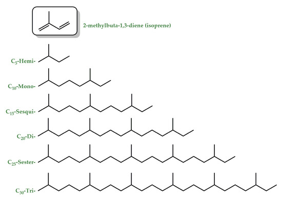 Terpenes. Terpenes constitute a large and diverse class of natural products with >55,000 known compounds [22]. The basic structure of terpenes is an isoprene (2-methylbuta-1,3-diene) unit, and based on the number of isoprene units in a molecule, terpenes can be classified as mono-(C10), sesqui-(C15), di-(C20), sester-(C25), and triterpenes (C30) (Figure 3) [23]. They are abundantly found in fruits, vegetables, and flowers [24], and their concentration is generally high during and immediately following flowering [25]. They are responsible for the typical fragrance of many plants and function as info chemicals, attractants, or repellents. At high concentrations, indeed, they can be toxic and are thus an important weapon against herbivores and pathogens [25,26]. Terpenes are biochemically transformed by adding functional groups containing heteroatoms to form terpenoids. The terms terpene and terpenoid are often used interchangeably [27]. Monoterpenes and most of the sesquiterpenes are volatile compounds and are primary components of essential oils (EOs), while diterpenes are the major components of resins due to their low volatility and high boiling points. EOs, less than 5% of the vegetable dry matter [28], are concentrated liquids of complex mixtures that can be extracted from all the different parts of plants or from the whole plant for a single botanical source [29,30]. Chemically, EOs are a rich mixture of numerous bioactive chemical components such as terpenes and terpenoids as major components and phenylpropanoids and others as minor constituents [31,32].