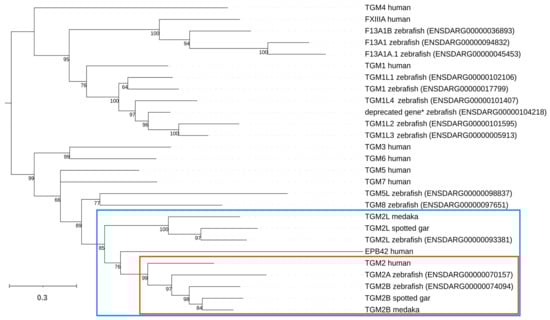 The orthologous TG genes in the zebrafish genome were originally described by Deasey and coworkers more than 10 years ago when only a handful of ray-finned fish genomes were available []. We used up-to-date zebrafish genomic information to perform a new phylogenetic maximum likelihood analysis (ML) to clarify the evolutionary relationships between zebrafish and human orthologs [,]. The data confirmed that the zebrafish TG gene family comprises 14 genes. Six of these clustered with high confidence (bootstrap support = 76) with human TGM1 and three with FXIIIA. The zebrafish genome encodes three sequences that belong with high confidence (bootstrap support = 85) to the same monophyletic clade of human TGM2 and EPB42 genes, highlighted by a blue box in Figure 1. Two of these, designated tgm2a and tgm2b by current nomenclature, can be considered as bona fide orthologs of the human gene (red box), whereas the third zebrafish sequence, named tgm2l, was more distantly related.
