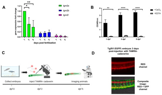 The three TG2 genes of zebrafish are expressed during embryonic development. (A) RT-qPCR expression analysis of zebrafish transglutaminase 2 genes. The graph shows the change in gene expression of the three zebrafish TG2 orthologs at 1, 3, and 5 dpf. Expression data are normalized against the zebrafish β-actin gene. * = p < 0.05, ** = p < 0.01. **** = p < 0.0001. (B) Transamidation activity of soluble protein lysates from zebrafish embryos was assayed by ELISA with and without 20 mM EDTA at 1, 3, and 5 dpf. (C) Schematic representation of the experimental protocols. Two dpf Tg(fli1:EGFP) embryos were microinjected into the yolk sac *with TAMRA-cadaverine. At 3 days after injection, the incorporated cadaverine was observed by epifluorescence microscopy. Created with BioRender.com. (D) Representative images show the trunk region in the red channel showing cadaverine incorporation and a composite image of the red and green channels showing the embryo vasculature.