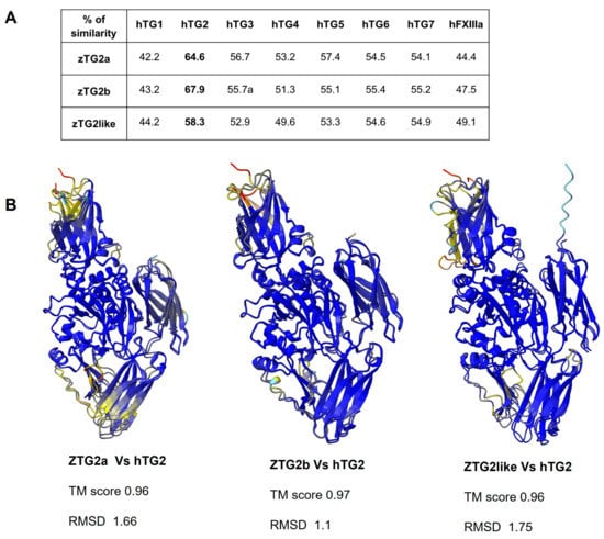 We obtained cDNA from whole zebrafish embryos and cloned the three zebrafish orthologs of human transglutaminase 2 using specific primers. The cloned genes were sequenced to determine the amino acid sequences for the three proteins (zTGs2), which we named zTG2a, zTG2b, and zTG2like. Both the DNA and amino acid sequences were then used to examine sequence divergence compared with the zebrafish reference strains. Interestingly, we found that the zTGs2 sequences diverged significantly between the strains studied. Whereas the sequence of cloned zTG2a is identical to that of the strain SAT, the sequence of cloned zTG2like is identical to that of the Tuebingen reference strain, and that of cloned zTG2b shows a different degree of divergence from the sequences of all other strains examined (Supplementary Tables S1–S6). Our results suggest that the observed differences are likely due to allelic variants that occur in different zebrafish populations and are not strictly associated with a particular strain. Subsequently, we aligned the three zTGs2 protein sequences with the human transglutaminases TG1-7 and FXIIIa (Figure 3A). We found that the protein sequence reflected the evolutionary relationships between the coding genes shown in the cladogram in Figure 1. zTG2b showed a higher degree of similarity with the human TG2 enzyme, with a homology of 68%. When compared with other members of the human TGs protein family, homology ranged from 43% for hTG1 to 56% for hTG3. Similar results were obtained for zTG2a, which has 65% homology with hTG2 compared with 42% for hTG1. TG2like was the isoform with the lowest similarity, achieving only 58% homology with hTG2. Since reliable structure prediction tools have recently become available, we decided to model the three-dimensional structure of TG2 in zebrafish. The 3D structures of the cloned proteins were modeled using Alphafold via Colabfold and later used for pairwise structure alignment with human TG2 [,,]. As expected, the proteins show the typical structural organization into four domains: an N-terminal β-sandwich, a catalytic core, and two C-terminal β-barrels. This was confirmed by a very high TM-score with values ranging from 0.96 to 0.97. Root mean square deviation (RMSD) was then calculated between the aligned pairs and the values were consistent with sequence homology, with zTG2b having an overall RMSD of 1.1 Å, followed by zTG2a with 1.66 and zTG2like with 1.75 Å, reflecting lower homology and greater evolutionary distance.
