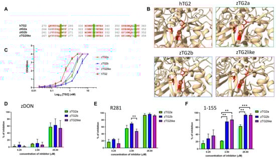 Enzymatic activity of TG2 (A) Multiple protein sequence alignment of the zTGs2 proteins and the hTG2. The catalytic triad Cys-His-Asp, highlighted in green, is conserved as many or the nearby residues that are in bold and highlighted in red. (B) 3D models of the human and zebrafish TGs2 active site, rendered with ChimeraX. The catalytic triad Cys-His-Asp is colored in red. (C) The three affinity-purified zTGs2 recombinant proteins were tested at increasing concentrations of proteins in ELISA by measuring the TG2-catalysed incorporation of pentylamine-biotin into DMC. Recombinant hTG2 was also used as positive control. The 450 nm absorbance values are plotted against the Log10 of the TGs2 concentration. The inhibitors were tested at 0.25, 2.5 and 25 μM. (D) ZDON (Zedira); (E) R281 and (F) 1-155. The graphs represent percentage of inhibition. Each plot represents the averaged result of three independent experiments (n = 3). ** = p < 0.01. *** = p < 0.001.