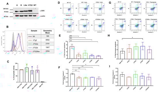 Zebrafish TGs2 activity in HEK293T cell model. HEK293 cells with overexpression of zTGs2 and hTG2 were isolated by transfection and selection with hygromycin. The expression of SV5-tagged protein was confirmed with α-SV5 tag antibody in (A) Western Blot on cell lysate and (B) flow cytometry detecting intracellular TG2 with V5 antibody on fixed and permeabilized stable cell clones. (C) Enzymatic activity was measured using cell lysate and normalized on the expression level of the TGs2. The data are expressed as a percentage of enzymatic activity relative to the hTG2-expressing HEK293 cell lysate, used as positive control. Apoptosis was induced in HEK293 cells expressing zTGs2, hTG2 and wild-type HEK293 by treatment with 0.4 mM H2O2 for 2 h (D–F) or 5 μM thapsigargin for 24 h (G–I). Treated cells were stained with Annexin V-FITC and propidium iodide (PI) and analyzed by flow cytometry to assess apoptosis. Dot plot representative experiment Annexin V and PI staining of treated samples ((D) for H2O2 and (G) for thapsigargin) and histogram plot of the percentage of Annexin V-FITC positive cells ((E) and (H) panel). Caspase 3 activity was measured directly on treated cells using Caspase 3/7 Glo® (Promega) ((F) for H2O2 and (I) for thapsigargin). * = p < 0.05, ** = p < 0.01. *** = p < 0.001.