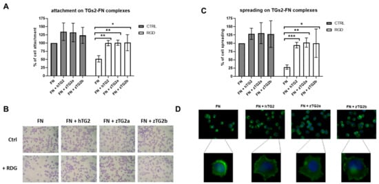 Zebrafish TGs2 mediate RGD-independent cell adhesion of HFDFs. Cell attachment (A) and cell spreading (B) on FN and TGs2-FN complexes were assessed ~20 min after seeding cells pre-incubated with 150 μg/mL GRGDTP synthetic peptide (RGD) (white bars) or serum-free medium (CTRL, grey bars). The plots represent the averaged results of three independent experiments. Data are expressed as mean ± S.D. of the percentage of cell attachment or cell spreading, compared to the control values on FN (100%). Mean attached cells value on FN control was 96 ± 25; mean spread cells value on FN control was 52 ± 10. The average number of total cells analyzed for the control sample was 543. *= p < 0.05; ** = p < 0.01; *** = p < 0.001. (C) microscopy of HFDFs seeded on FN and FN-TGs2 complexes after incubation with RGD peptide or control. Representative images of HFDFs seeded on FN and FN-TGs2 complexes after incubation with RGD peptide or control. Images after fixation, permeabilization, and May–Grunwald and Giemsa staining for the cytoplasm and for the nucleus, respectively (100× magnification). (D) Epifluorescence microscopy of HFDFs seeded on FN and FN-TGs2 complexes, after incubation with RGD peptide or serum-free medium. Actin stress fibers were visualized using fluorescein isothiocyanate (FITC)-labelled phalloidin (200× magnification).
