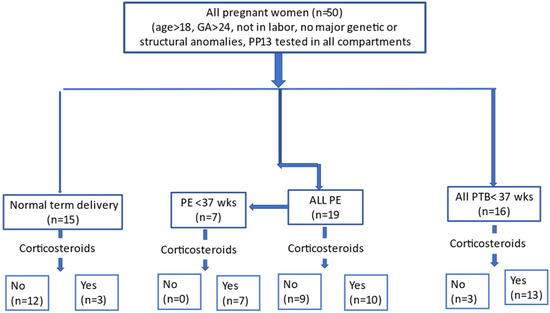 Study flow chart. We enrolled 50 patients—19 cases of PE, of whom 7 delivered at GA < 37 weeks’ gestation due to PE severity (PE < 37 wks), 16 PTD delivered at GA < 37 weeks’ gestation (PTD < 37 wks) unrelated to PE or other iatrogenic causes, and 15 term delivery controls. The number of women treated and untreated with corticosteroids (+/−) is shown.