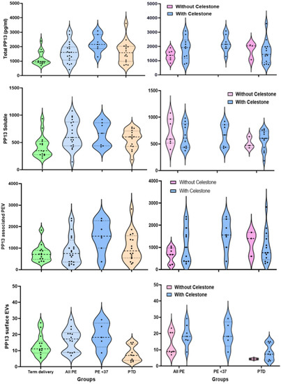 Violin plot of PP13 levels as a function of the different fractions. The four panels on the right side are the violin plots of the level of PP13 in the total fraction (top), the solubilized fraction (below), the PEV-associated fraction (below), while the very bottom plot is the PP13 of the surface of PEV. The four panels on the left side are the violin plots of the same PP13 fractions for the groups of patients treated with (pink) and without (blue) corticosteroids. In each violin plot, the horizontal dashed line represents the lower quartile, the median, and the third quartile. Dots along the violin show different patients’ values within the violin. The longitudinal lines on both violin apexes represent the minimum and the maximum values. PE—preeclampsia, PTD—preterm delivery, PE < 37—preterm PE, PEV—placental-associated extracellular vesicles.