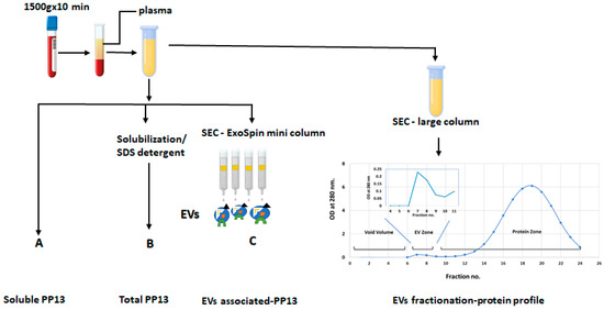 To quantify the total PP13 in the plasma (soluble and PEV-associated PP13), the plasma was treated with 0.1% sodium dodecyl sulphate-SDS/PBS as a detergent for 30 min on ice to solubilize the EVs and release the PP13 content in the EV compartments (inside and outside) [39]. Total PP13 was determined in the solubilized proteins by ELISA as described in Section 4.6 below. The profile of the SEC before and after detergent treatment is shown in Supplementary Figure S1.