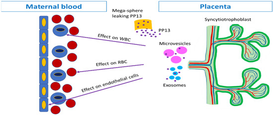 PP13 pathways to the maternal circulation. The placenta syncytiotrophoblast (green to the right) releases PP13 through the uterine vein into the maternal circulation (the blue blood vessel to the left). The PEVs serve as the communication pathway. The microvesicles (pink) and the exosomes (turquoise) carry PP13 (purple) on their surface and inside. There is also a leakage of soluble PP13 (purple) either into the intracellular space or through necrotic vesicles (orange) that are too big to pass through the capillaries, thus, leaking their content into the soluble fraction of the maternal circulation. PP13 is, thus, liberated either as a soluble protein or in association with the PEVs. Clinical pathologies affect PP13 mainly via the PEV pathway. When reaching the maternal circulation, PP13 binds to the ABO antigen on the red blood cells (RBC, [47]), the white blood cells (WBC [3,26]), or the endothelial layer [27,28,48], Sammar et al. Elements of this figure were modified from our former review Sammar et al. [7] Int. J. Mol. Sci. 2019, 20, 3192. https://doi.org/10.3390/ijms20133192.