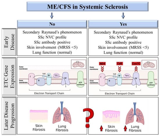 Comparison of factors associated with ME/CFS in SSc patients. SSc-CFS and SSc-NCFS patients are not distinguishable from each other based on early SSc disease-related factors. Electron transport chain gene (ETC) expression distinguishes SSc-CFS patients from SSc-NCFS patients, with reduced ND4 and CyB expression and increased Cox7C gene expression. ETC gene expression correlates with measures of disease severity, including skin thickening and lung function.