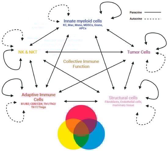 Manifestation of emergent collective immune functions through the multi-directional mutual interactions of immune cells in the TME. Multi-directional mutual interactions of the immune cells and non-immune cells in autocrine and paracrine fashions dynamically shaping the collective immune function in the TME.