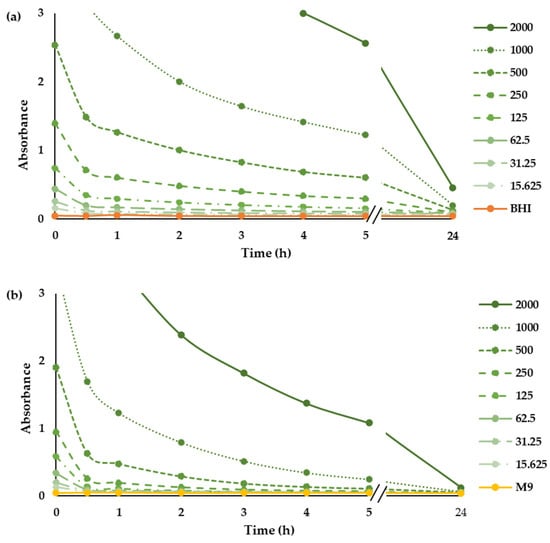 Photostability of CHL. Time-dependent absorption spectrum of CHL (µg mL−1) at 660 nm in BHI (a) and M9 (b) medium.