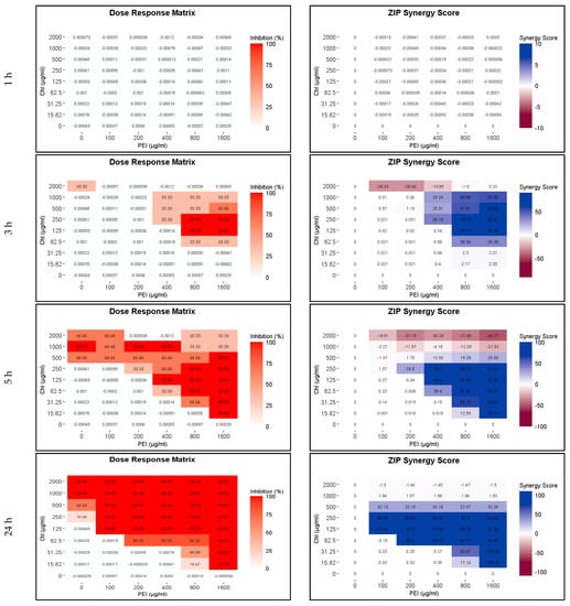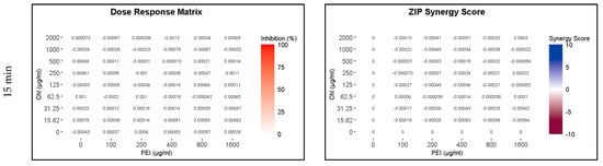 PEI potentiates the action of β-lactam antibiotics against methicillin-resistant Staphylococcus aureus [31], and recently, we found that PEI potentiates the efficacy of CHL against E. coli [25]. In the first step, we examined whether PEI could also potentiate the function of CHL against P. aeruginosa. Between 0 and 2000 µg mL−1 of CHL and between 0 and 1600 µg mL−1 of PEI were tested alone and in combination (Figure 2). Unilluminated CHL, PEI alone and the red-light source had no lethal effect under the tested conditions. Compared to the individual compounds, which have no bactericidal effect after 3 h of incubation, the combination of 125 µg mL−1 CHL and 800 µg mL−1 PEI led to the eradication of bacteria by 99.99% (4 log10 reduction). By increasing the exposure time to 5 h, the minimal bactericidal concentration (MBC) was reduced twofold to 125 µg mL−1 CHL and 400 µg mL−1 PEI (Figure 2). After 24 h, the highest tested concentrations of the illuminated CHL alone (1000 and 2000 µg mL−1) eradicated the planktonic cells by 99.99% (Figure 2). The concentration of 100 µg mL−1 PEI potentiated a lower concentration of CHL (125 µg mL−1) to exert the same effect, with a potentiation score of 97% shown in the dose–response and the synergy score matrices in Figure 2. The staircase pattern in the dose–response matrices indicates the efficacy of multiple combinations against planktonic cells. These results prove that the lethal effect of lower doses of the CHL and PEI increases with increasing exposure time, and the effect of the CHL alone started to appear after 5 h.