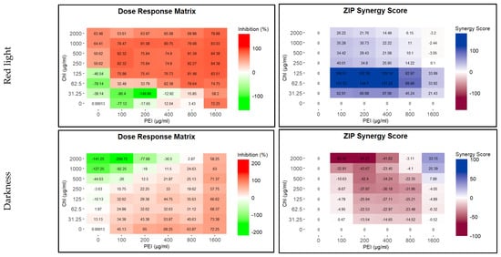 Influence of illuminated chlorophyllin (CHL) and polyethylenimine (PEI) on P. aeruginosa growing cells. The dose–response matrices show the effect of the double serial dilution of CHL and PEI individually and in combination. ZIP (zero interaction potency) synergy score matrices depict the synergistic effect between CHL and PEI. The matrices were plotted using RStudio SynergyFinder R package. The results are an average of four biological replicates.