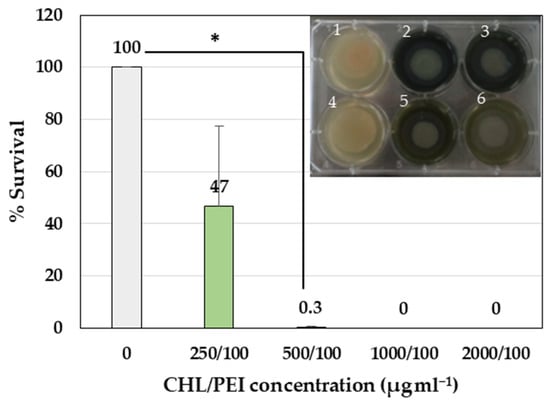 Antibiofilm activity of CHL and PEI on established colony biofilm. Error bars represent standard deviation of the mean (n = 3). The photo represents the established P. aeruginosa colony biofilm on a polycarbonate membrane on BHI agar (1: growth control, 2: CHL/PEI 2000/100 µg mL−1, 3: CHL/PEI 1000/100 µg mL−1, 4: sterility control, 5: CHL/PEI 500/100 µg mL−1, 6: CHL/PEI 250/100 µg mL−1). The untreated sample was normalized at 100%. * t-test: p-value < 0.05.