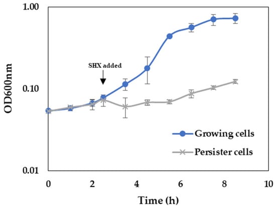 The persistence of P. aeruginosa can be induced by amino acid starvation and subsequent induction of stringent response [34,35]. For this purpose, the amino acid analog serine hydroxamate (SHX) was added to the M9 medium, and growth was monitored (Figure 5). As expected, in response to SHX addition, a growth arrest of P. aeruginosa was observed.