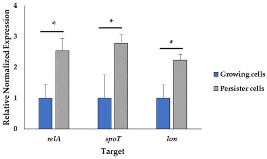 Induction of the stringent response. The normalized gene expression relative to the reference gene rpoS of the treated and untreated samples using the 2−ΔΔCt method. Data represent the mean value of three biological replicates with three technical replicates (n = 9). Error bars represent the standard deviations. * t-test: p-value < 0.05.