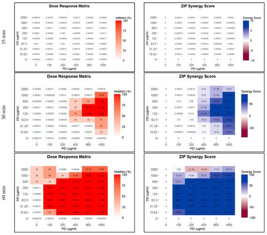 The influence of growth medium and incubation time on biofilm formation was analyzed via one-way ANOVA, the TUKEY test (p < 0.05) [62]. The matrices of the dose–response and ZIP synergy score were plotted using the RStudio SynergyFinder R package (version 2023.03.0+386) [63]. The synergy score range from 0 to 100, with a higher value indicating better efficacy and a ZIP score lower than 0 indicating antagonism [63]. In this study, the zero interaction potency (ZIP) was utilized as a reference model to examine the interaction between CHL and PEI because the ZIP method calculates a synergy score based on a mathematical model considering the dose–response relationship of each antimicrobial agent individually and in combination. In addition, it assumes that antimicrobial agents are independent and do not interact with each other when combined, allowing significant and precise definitions of synergy, additivity and antagonism in the study of antimicrobial interaction [64].