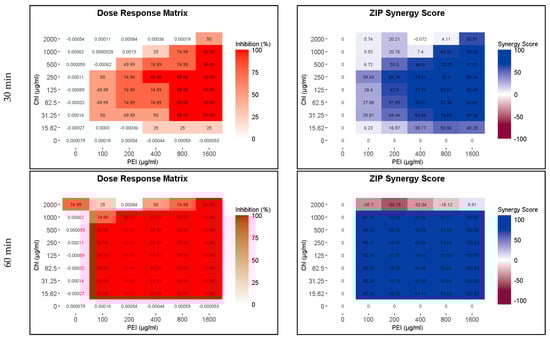 Influence of illuminated chlorophyllin (CHL) and polyethylenimine (PEI) on P. aeruginosa persister cells. The dose–response matrices show the effect of the double serial dilution of CHL and PEI individually and in combination. ZIP (zero interaction potency) synergy score matrices depict the synergistic effect between CHL and PEI. The matrices were plotted using RStudio SynergyFinder R package. The results are an average of four biological replicates.