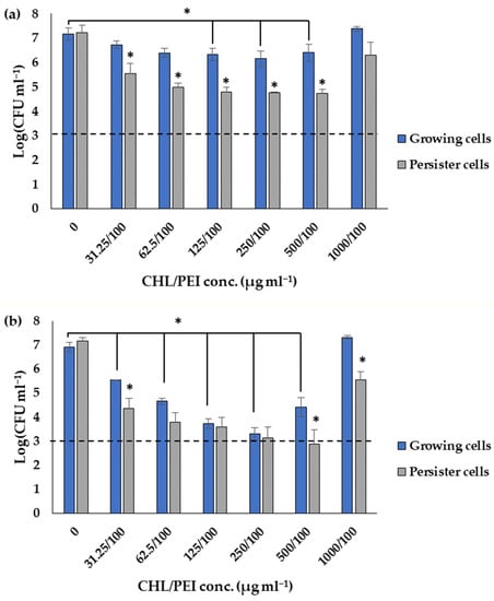 Influence of different concentrations of chlorophyllin (CHL) and 100 µg mL−1 polyethylenimine (PEI) on growing and persister cells after exposure to red LEDs for 15 min (a) and 30 min (b). The dashed line corresponds to a 4 log10 reduction (99.99% killing efficacy). Data represent the mean value of three biological replicates. Error bars represent the standard deviations. * t-test: p-value < 0.05.