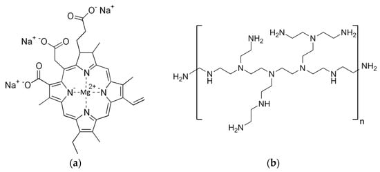 Non-copperized chlorophyllin sodium salt (CHL), Mw 684.9 g mol−1, CAS number 15203-43-7, was purchased from Carl Roth GmbH (Karlsruhe, Germany). Polyethylenimine (PEI), 25 kDa branched, CAS number 9002-98-6, was purchased from Sigma-Aldrich (St. Louis, MO, USA). For chemical structures, see Figure 10.
