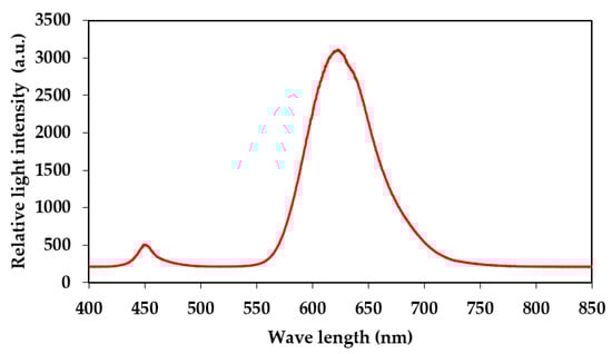 A red LED light source for aPDI was obtained from Shenzhen Cooleeon Electronics Co., Ltd., Shenzen, China. The LED emission spectrum was tested using an Ocean Optics usb2000 spectrophotometer with the average maximum emission spectrum of the LEDs being 623 nm (Figure 11). Samples in 6-well or 96-well plates were placed 10 cm away from the LED source to ensure the equal distribution of the light, and a fan was placed near the construction to avoid temperature increase during the irradiation process. The light intensity measured at the surface of the plates using quantum radiation probe FLA 623 PS connected to an ALMEMO 2490 device (Ahlborn, Mess- und Regelungtechnik GmbH, Holzkirchen, Germany) was 1537 ± 130 µmol m−2 s−1. This light intensity corresponds to 295.55 J m−2 s−1.