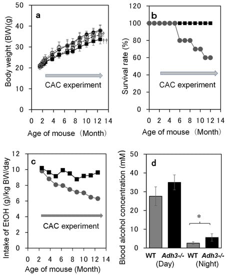 Both strains of mice (WT and Adh3-/-) continuously increased their body weights in the control (C) and ethanol (E) groups during 12 months of CAC treatment. Body weights were significantly lower in Adh3-/- than in WT in both the C (7% lower, p < 0.001 by 2-way ANOVA) and E (11% lower, p < 0.0001) groups. When compared between C and E groups, the body weights of Adh3-/- were significantly lower in the E group than in the C group (5% lower, p < 0.001), whereas those of WT exhibited no significant difference between C and E groups (Figure 1a). Adh3-/- did not die during the CAC experiment, whereas WT started to die after four months of CAC and exhibited a 60% survival rate at the end of the CAC experiment (Figure 1b). The ethanol intake of Adh3-/- mice was almost constant during the CAC experiment, whereas that of WT mice gradually decreased and was 34% less than that of Adh3-/- mice after 12 months of treatment (Figure 1c). Blood alcohol concentration (BAC) measured near the end of the experiment was higher in Adh3-/- than in WT (p = 0.033 by Student’s t-test for Adh3-/- (5.92 ± 2.76) vs. WT (2.65 ± 0.71) at night), consistent with the ethanol intake results. The BAC was much higher during the day (Adh3-/-; 35.02 ± 7.76, WT; 27.62 ± 4.98) than at night in both strains (p < 0.001 for the day vs. night) (Figure 1d).