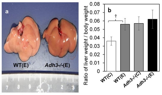 Liver steatosis of mice after 12 months of chronic alcohol consumption (CAC). (a) Gross picture of livers of WT and Adh3-/-. (b) Ratio of liver weight to body weight. (C) Water control; (E) 10% ethanol. n = 5. †: p < 0.001.