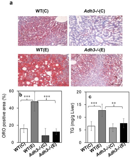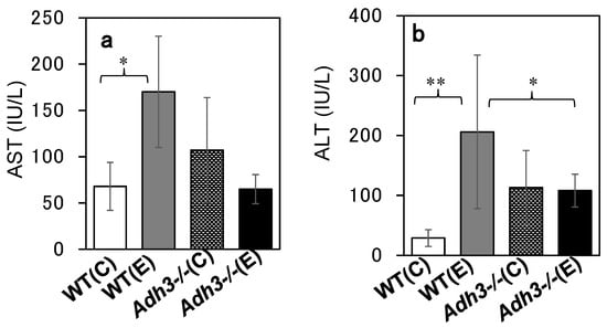 The livers were removed from the mouse body, rinsed with saline, and evaluated for ALD. Comparing the gross images of the livers of WT and Adh3-/- mice after 12 months of the CAC experiment, WT livers were enlarged and whitish similar to a fatty liver, whereas Adh3-/- livers looked almost normal (Figure 2a). The ratio of liver weight to body weight in WT mice was significantly increased following CAC treatment (p < 0.001 for WT (E) (0.056 ± 0.007) vs. WT (C) (0.036 ± 0.005)). In contrast, that in Adh3-/- mice was not increased by CAC (Figure 2b), as it was already higher in the control group owing to the lower body weight (Adh3-/- (C) (0.055 ± 0.011), Adh3-/- (E) (0.059 ± 0.012)) (Figure 1a) [13,23]. Oil red O (ORO) staining showed marked lipid droplets in the liver tissue of WT (E) mice. However, the droplets were not noticeable in WT (C), Adh3-/- (E), and Adh3-/- (C) (Figure 3a). Even though the droplets were observed in the liver of these three groups, the sizes were smaller than those of WT (E). The rate of the ORO-positive area with lipid droplets >60 pixels was significantly higher in WT (E) (47.6 ± 11.2) than in WT (C) (16.1 ± 4.4), Adh3-/- (E) (8.0 ± 8.3), and Adh3-/- (C) (12.6 ± 3.3) (p = 0.0052 for WT (E) vs. WT (C), p = 0.0032 for WT (E) vs. the other groups), and was not different among WT (C), Adh3-/- (E), and Adh3-/- (C) (Figure 3b). A significantly higher rate of ORO-positive area in the WT (E) was observed at four months of CAC, compared with the other groups. Liver triglyceride (TG) levels after 12 months were significantly increased in WT (E), compared to WT (C) (p = 0.0027 for WT (E) (12.72 ± 2.46) vs. WT (C) (6.51 ± 1.75)). However, the levels were not significantly increased in Adh3-/- (E), compared to Adh3-/- (C) (Adh3-/- (E) (7.66 ± 1.79), Adh3-/- (C) (5.87 ± 1.55), p < 0.01 for WT (E) vs. Adh3-/- (C) or Adh3-/- (E)) (Figure 3c). Serum aspartate aminotransferase (AST) and alanine aminotransferase (ALT) levels were significantly increased in WT, and unaffected in Adh3-/- after 12 months of CAC (AST: p = 0.027 for WT (E) (170 ± 60) vs. WT (C) (68 ± 26), ALT: p < 0.01 for WT (E) (206 ± 128) vs. WT (C) (29 ± 14)) (Figure 4).