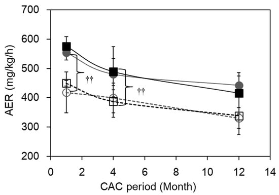 Figure 5 shows the changes in AER for both strains during the CAC experiment. AER was significantly enhanced by CAC in both strains during all experimental periods (p < 0.0001 by 2-way ANOVA for WT (E) vs. WT (C) and for Adh3-/- (E) vs. Adh3-/- (C)). However, the difference in the AERs between WT and Adh3-/- was not obvious in either the C or E group. Despite the induction of ALD after four months of CAC in the WT(E) mice, the AER was still higher than that of WT (C) mice. However, the AERs decreased with age in both groups E and C for both strains (Figure 5).