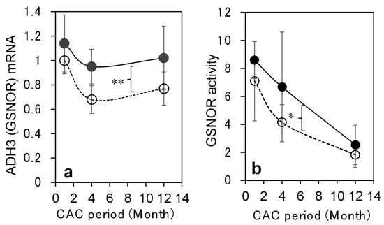 Changes of ADH3 (GSNOR) in the livers of WT mice during CAC. (a) ADH 3 (GSNOR) mRNA levels in WT livers during CAC. ADH3 mRNA levels were expressed by the amount ratios of ADH3 mRNA to β-actin mRNA. The amounts of ADH3 and β-actin mRNAs were determined by a reverse transcription-quantitative PCR (RT-qPCR) analysis. (b) GSNOR activity in WT livers during CAC. Activity was measured using S-nitrosoglutathione (GSNO) as a substrate and expressed as unit/mg of liver protein. ●: WT(E), ○: WT(C). **: p < 0.01 by 2-way ANOVA, *: p < 0.05 by FTEST. (n = 5 per month).