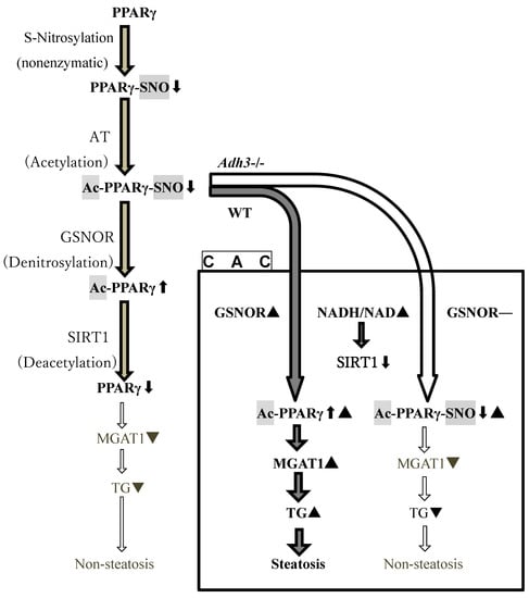 Although PPARγ generally distributes at low levels in the liver [29,30], it plays an important role in the induction of liver steatosis via the expression of MGAT 1, a key enzyme in TG synthesis, with increasing its liver content [11]. In this study, we demonstrated that only WT mice, but not Adh3-/-, exhibited ALD induced by CAC, with a significant increase in liver ADH 3 mRNA and GSNOR activity during the experimental period. These data suggest that ADH 3 contributes to the onset of ALD via GSNOR activity, which further activates PPARγ via denitrosylation. Even though CAC increases acetylated PPARγ (Ac-PPARγ) levels in the liver by inhibiting SIRT 1 activity due to the increase in the NADH/NAD ratio, our results suggest that Ac-PPARγ-SNO is inactive in expressing MGAT 1 without denitrosylation as the fatty liver was not induced in Adh3-/-, in which Ac-PPARγ-SNO cannot be denitrosylated because of the lack of GSNOR (Figure 7). These findings indicate that ADH 3 plays a key role in the onset of ALD, probably as a GSNOR, by activation of PPARγ in the liver via denitrosylation. We propose a new hypothesis regarding the cause of CAC-induced hepatic steatosis, as shown in Figure 7. In order to verify our hypothesis, further investigations are required to provide evidence that an inactive form of S-nitrosylated Pear is increased in Adh3-/- mice, thereby, depressing the expression of target genes, such as MGAT 1, in the liver during CAC, compared to the case of the WT mice.