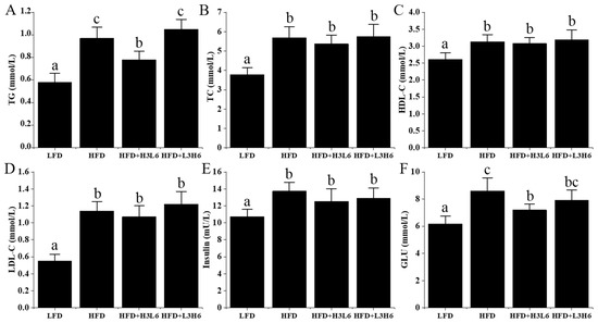 The effect of a low LA/ALA ratio on plasma lipids, insulin, and glucose. (A) TG; (B) TC; (C) LDL-C; (D) HDL-C; (E) insulin; (F) GLU. Different letters indicate significant differences (p < 0.05) between each group, and the same letters indicate that there is no significant difference (p > 0.05) between each group.