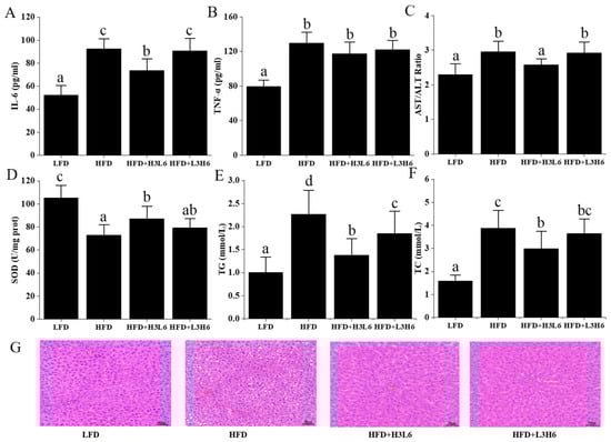 The effect of a low LA/ALA ratio on the liver. (A) IL-6; (B) TNF-α; (C) AST/ALT ratio; (D) SOD; (E) TG; (F) TC; (G) liver morphology (H&E). Different letters indicate significant differences (p < 0.05) between each group, and the same letters indicate that there is no significant difference (p > 0.05) between each group.