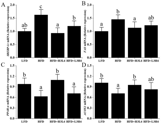 In order to understand how a low LA/ALA ratio affects lipid metabolism, researchers examined gene expression. The results showed that compared to the HF group (Figure 4), the other groups exhibited a significant downregulation (p < 0.05) in the expression of fatty acid synthase (FAS) and SREBP-1c genes. Notably, the HFD+H3L6 group demonstrated the most pronounced effect. The low LA/ALA ratio also significantly elevated acyl-CoA oxidase 1 (ACOX1) in lipid synthesis (p < 0.05). These results suggest that the presence of a low ratio of LA/ALA inhibited the downregulation of PPAR-α mRNA levels by a high-fat diet under high-fat diet conditions. Through the data analysis, it was observed that ACOX1, a downstream target involved in fatty acid oxidation, exhibited a similar pattern.