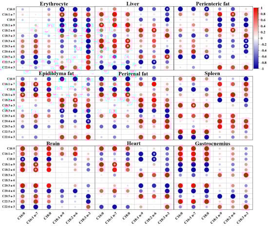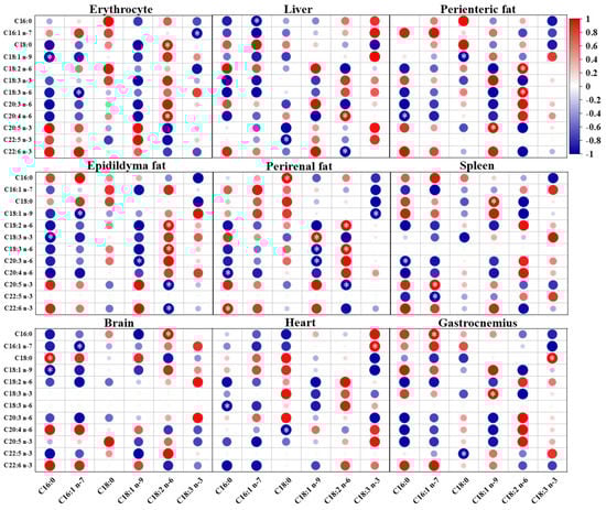 The Pearson correlation between fatty acids in the low LA/ALA ratio group and twelve fatty acids in the erythrocyte and eight organs (red denotes positive correlations and blue denotes negative correlations. The larger the circle, the higher the correlation coefficient. ∗ denotes the significant correlation (p < 0.05)).