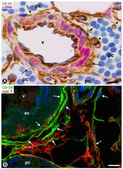CD34+ SCs/TCs forming labyrinthine systems around medium-sized vessels (v) in the septa of a parathyroid gland. (A) A medium-sized vessel is observed showing CD34+ endothelial cells (brown) in the intima, αSMA+ smooth muscle cells (red) in the media, and delimiting TCs/CD34+ SCs (brown) in the adventitia. Note that TCs/CD34+ SCs adventitial cells are in continuity with TCs/CD34+ SCs in the interstitium and those around small vessels (arrowheads) and delimiting parenchymal cell clusters (arrows). (B) An image of a similar region observed by immunofluorescence in which endothelial cells (ec) and TCs/CD34+ SCs (arrows) express CD34 (green, ec with weak expression). Note that collagen I (red) is associated with TCs/CD34+ SCs. pc: Parenchymal cells. (A) Double immunochemistry for CD34 (brown) and αSMA (red). Hematoxylin counterstain. (B) Double immunofluorescence for CD34 (green) and collagen I (red). DAPI counterstain. Scale bars: (A,B) 15 µm.
