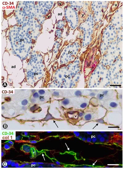 TCs/CD34+ SCs are observed in the fibrous capsule, septa, and thin tracts of the parathyroid gland, especially those around the more peripheral parenchymal clusters contacting the septa. These structures include different-sized vessels and variable amounts of adipose tissue. TCs/CD34+ SCs form a labyrinthine system, especially in capsular and septal regions, in which medium-sized vessels show CD34+ ECs, smooth muscle actin positive (SMA+) medial vascular smooth muscle cells, and two or more layers of TCs/CD34+ SCs in their adventitia (Figure 1A). Collagen I was present in this adventitial area with TCs/CD34+ SCs (Figure 1B). In these regions, the adventitial TCs/CD34+ SCs were in continuity with those in the interstitium and delimiting clusters of parenchymal cells (Figure 1A,B). The location of TCs/CD34+ SCs around small vessels and parenchymal cells was evident in the thinner trabeculae and tracts with fibrous or loose connective tissue (Figure 2 and Figure 3). TCs/CD34+ SCs and their telopodes were also present between the adipocytes in the septa and thin tracts of the parathyroid glands (Figure 2A).