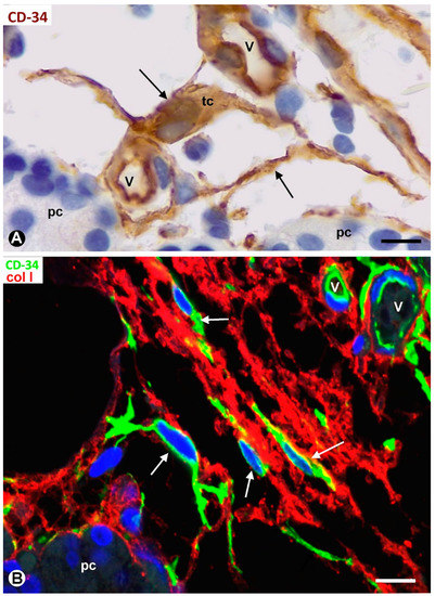 (A) The somatic region of a TC/CD34+SC (tc) and several telopodes (arrows) of this cell and other TCs/CD34+ SCs are observed in the interstitium and around small vessels (v) and clusters of parenchymal cells (pc) in a thin connective tract of a parathyroid gland. (B) TCs/CD34+ SCs and telopodes (arrows, green) are observed between a fibrous tract with thick fascicles of collagen I (red) arranged between a small vessel (v) and a cluster of parenchymal cells (pc). (A) Immunochemistry for CD34 (brown). Hematoxylin counterstain. (B) Double immunofluorescence for CD34 (green) and collagen I (red). DAPI counterstain. Scale bars: (A) 12 µm; (B) 15 µm.