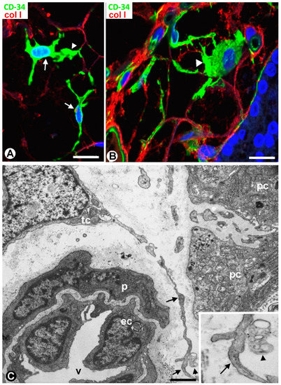 Small vessels within the parenchymal cell clusters, predominantly in areas furthest from the connective septa, were devoid of surrounding TCs/CD34+ SCs (Figure 5A–C). TCs/CD34+ SCs were also absent around the adipocytes associated with these small vessels within the parenchymal clusters (Figure 5C). Collagen I was not observed or decreased in the areas in which TCs/CD34SCs were absent or scarce (Figure 5B,C). Transitional regions with and without perivascular TCs/CD34+ SCs and collagen I were also seen (Figure 6A).