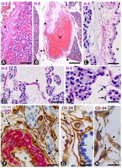 - Díaz-Flores, L.; Gutiérrez, R.; González-Gómez, M.; García, M.P.; Palmas, M.; Carrasco, J.L.; Madrid, J.F.; Díaz-Flores, L., Jr. Delimiting CD34+ stromal cells/telocytes are resident mesenchymal cells that participate in neovessel formation in skin Kaposi sarcoma. Int. J. Mol. Sci. 2023, 24, 3793. [Google Scholar] [CrossRef]