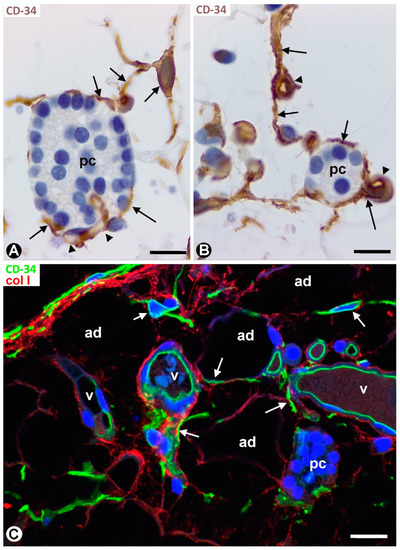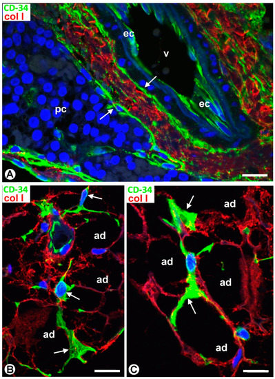 (A–C) Small vessels (arrows, brown in (A) and green in (B,C)), devoid of surrounding TCs/CD34+ SCs, are observed within the parenchymal cell clusters (pc). Collagen is not present in these areas in which TCs/CD34+ SCs are absent (B,C). Also note the absence of TCs/CD34+ SCs between adipocytes (ad) in these areas (C). (A) Immunochemistry for CD34 (brown). Hematoxylin counterstain. (B,C) Double immunofluorescence for CD34 (green) and collagen I (red). DAPI counterstain. Scale bars: (A) 12 µm, (B,C) 20 µm.