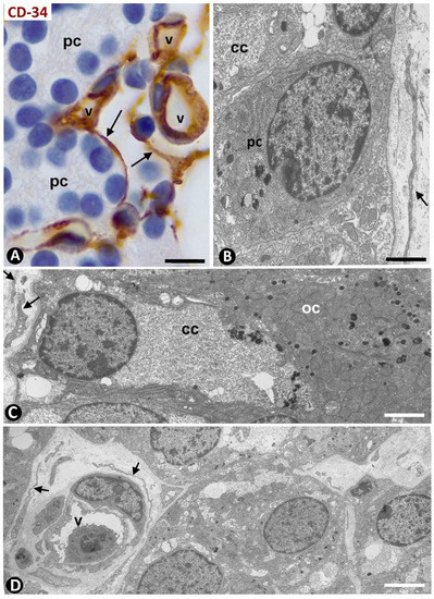 (A) Processes of TCs/CD34+ SCs (arrows) around parenchymal cell nests (pc) and small vessels (v) in hyperplastic parathyroids. (B–D) Ultrastructural demonstration of the arrangement of telocyte telopodes around a principal cell (pc) in (B), a clear cell (cc) with intracytoplasmic glycogen and an oxyphilic cell (oc) in (C), and a vessel (v) and several parenchymal cells in (D). (A) Immunochemistry for CD34 (brown). Hematoxylin counterstain. (B–D) Ultrathin sections. Uranyl acetate and lead citrate. Scale bars: (A) 15 µm, (B,C) 4 µm, (D) 8 µm.