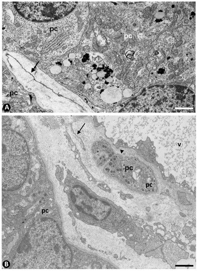 (A) A telocyte telopode (arrow) is observed around parenchymal cells (pc), showing scarce secretory granules, variable organelle development, and presence of lysosomes. (B) An isolated principal cell with secretory granules (pc, arrowhead) arranged between a fenestrated vessel (v) and telopodes (arrow). Ultrathin sections, uranyl acetate, and lead citrate. Scale bars: (A,B) 3 µm.